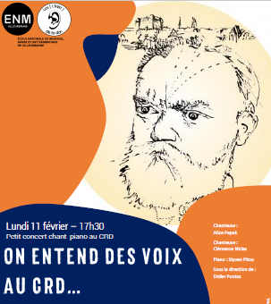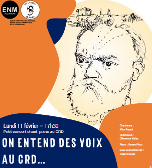 Lundi 11 février à 17h30, deux élèves chanteuses et un pianiste interpréteront les trois duos moraves d’Antonin Dvorak et deux mélodies de Gabriel Fauré : « Puisqu’ici-bas toute âme » et « Tarentelle ».