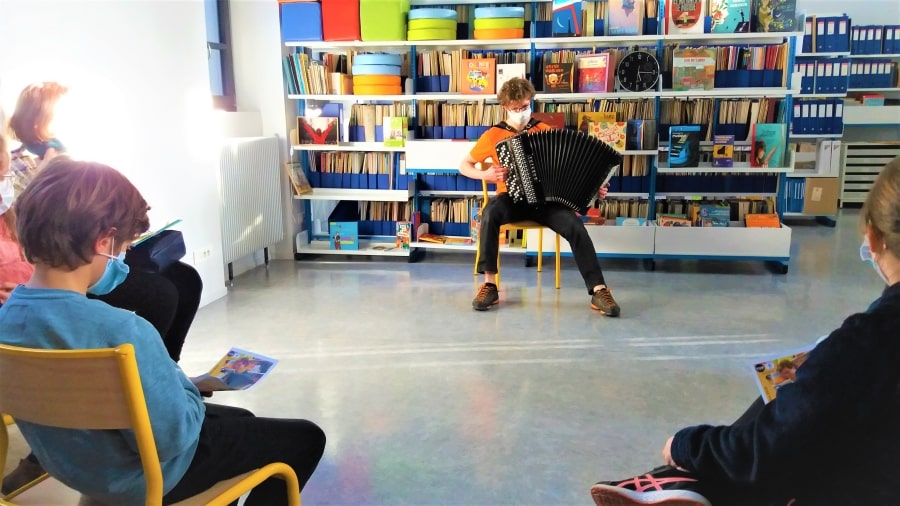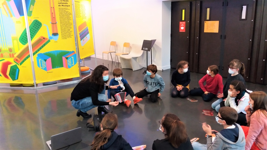 Le temps d’une heure, deux classes d’élèves de FM 1er cycle ont pu assister à tour de rôle et avec leur enseignante respective, à l’ [ i.nwi ] d’un élève accordéoniste, Adrien et à une médiation autour du DRING grâce à Valérie. Le DRING, dont l’accordéon est l’instrument-symbole, est le module éphémère installé dans le Foyer Pollock de l’ENM faisant écho à l’exposition » Instrument voyageur » du Rize à Villeurbanne. Un moment émouvant de partage qui nous a permis d’écouter en toute intimité et de mieux comprendre l’instrument. Les enfants n’ont pas hésité à poser de nombreuses questions !