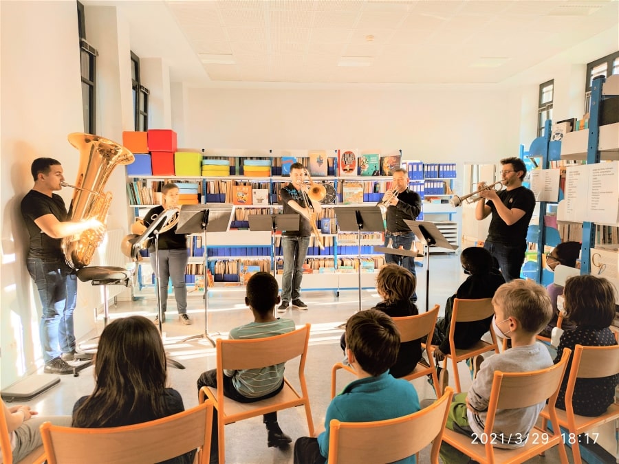 Le quintette de cuivres de musique de chambre de l’ENM a proposé aux enfants d’éveil 3 un [ i.nwi ] de reprises en tous genres : Des extraits de l’opéra Porgy and Bess (arrangés par Cédric Gautier, enseignant de trompette de l’école) jusqu’à un medley des tubes de Lady Gaga en passant par des pièces de Grieg. Une belle présentation des cuivres ainsi que des questions d’enfants ont pu enrichir ce joli moment de partage. De quoi réjouir les enfants… et le quintette !