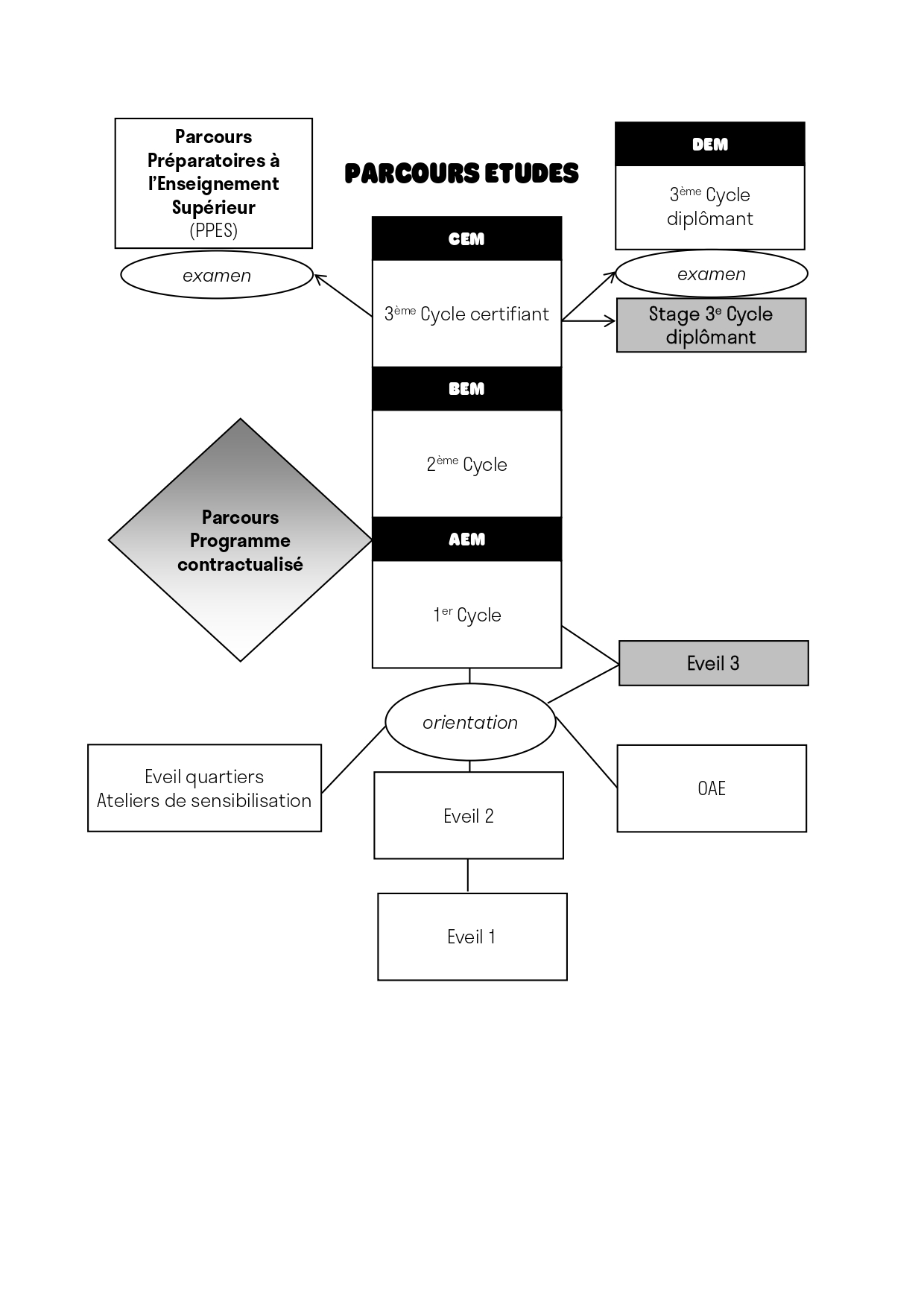 – du Parcours études composé de trois grands cycles d’études certifiants ou diplômants, comprenant pratiques collectives, culture et discipline dominante (voir les annexes par départements pédagogiques).