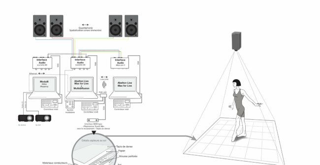 En se déplaçant sur un tapis de danse interactif, le public et les danseurs déclenchent de façon aléatoire des séquences sonores et visuelles. Le sol devient alors instrument et surface de projection.